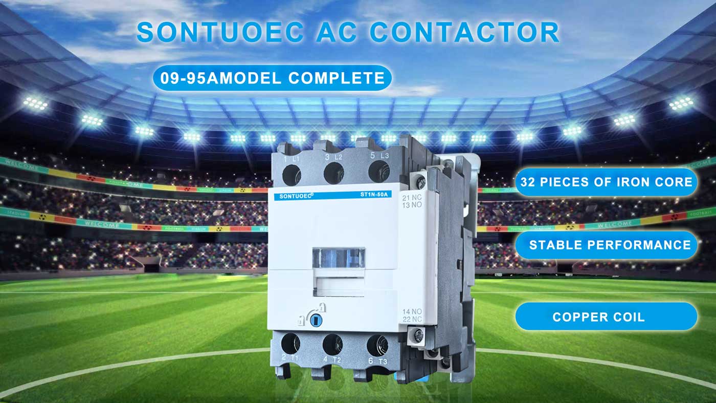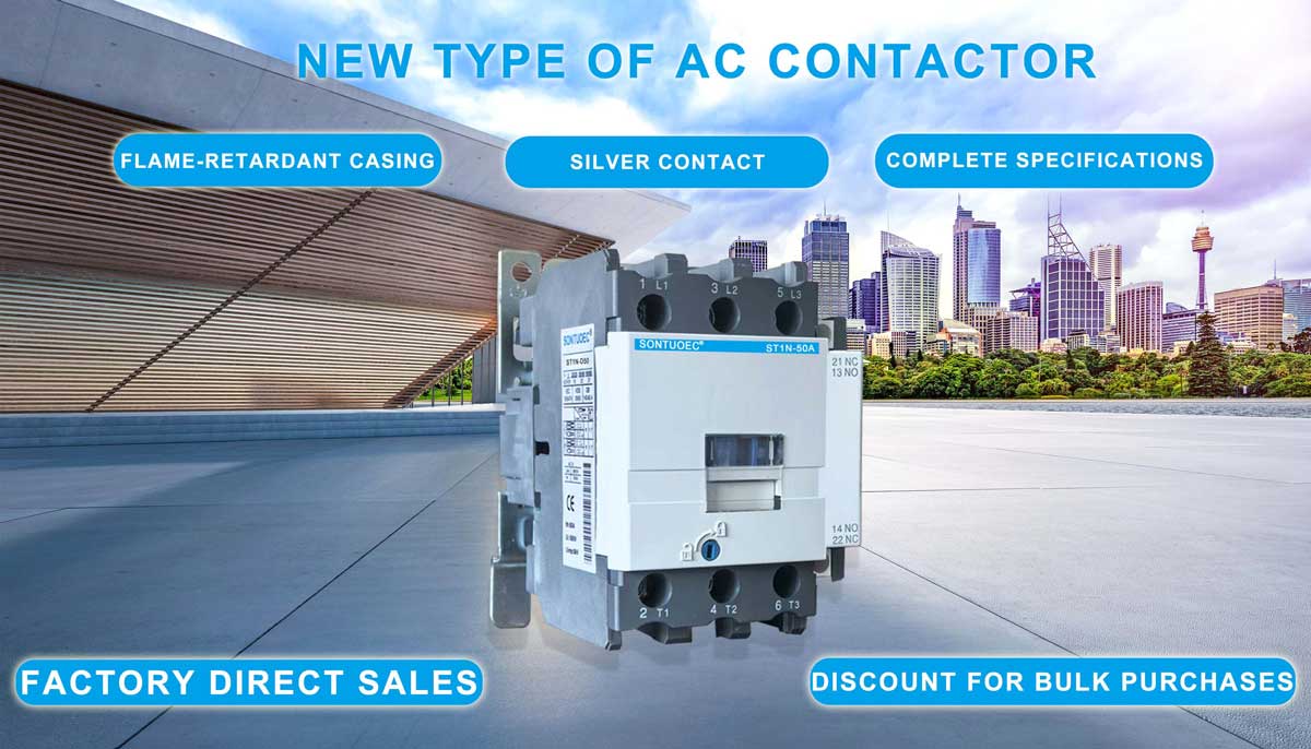 SONTUOEC is one of the Chinese suppliers/manufacturers specializing in the production of various small electrical appliances ST1N Series AC Contactor is suitable for using in the circuits the rated voltage up to 660V AC 50Hz or 60Hz, rated current up to 95A, for making & breaking, frequently starting & controlling the AC motor. Combined with the auxiliary contact block, timer delay & machine- interlocking device etc, it becomes the delay contactor, mechanical interlocking contactor, star-delta starter. With the thermal relay, it is combined into the electromagnetic starter. The Contactor is produced according to IEC 60947-1.
